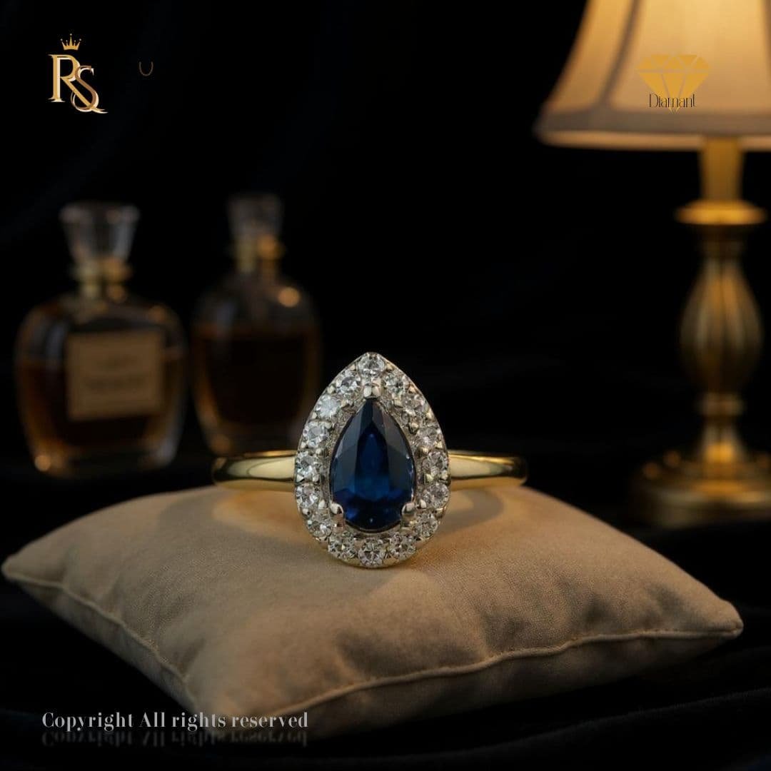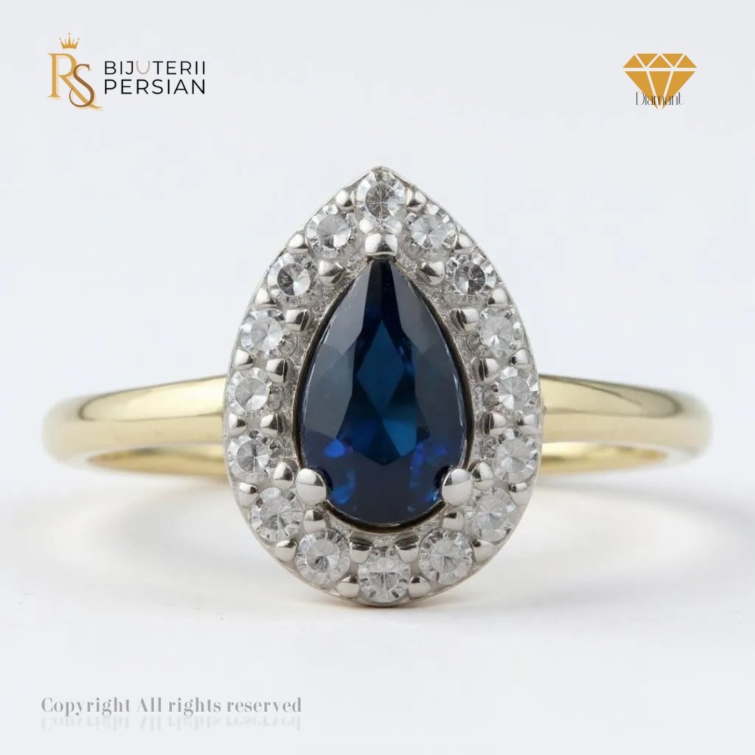 Inelul „Sofia” impresionează prin designul său nobil, cu un safir albastru intens în formă de picătură, înconjurat de 16 diamante certificate IGI. Realizat din aur galben 14K, este alegerea perfectă pentru femeile elegante.