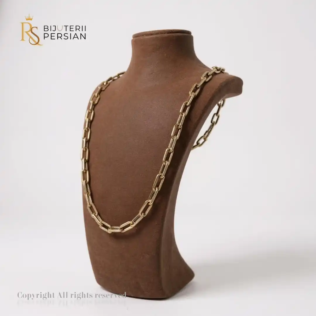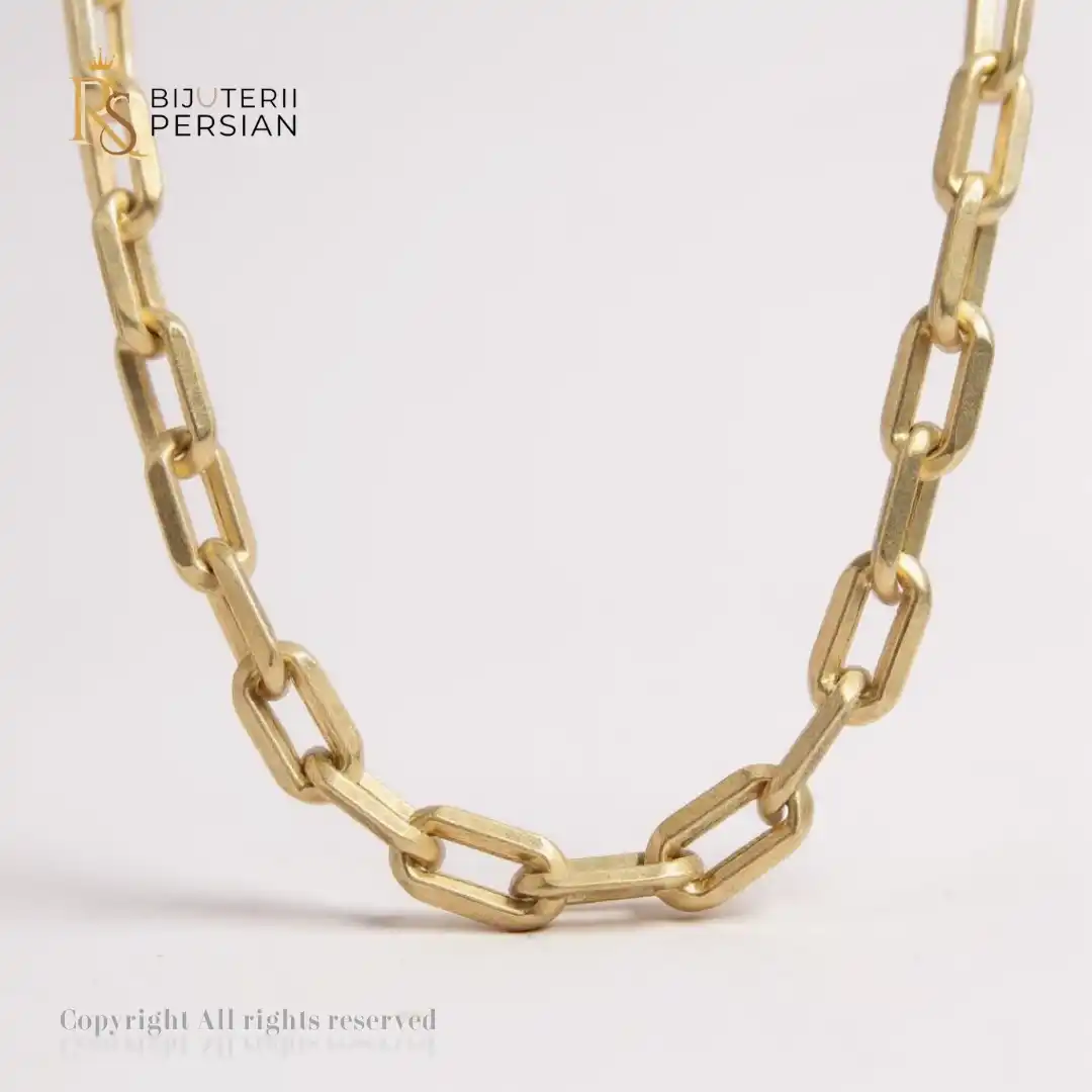 Acest lanț din aur galben de 14K se remarcă prin designul său sobru și elegant, cu zale ovale, alungite, care creează un ritm vizual armonios și impunător. Modelul este inspirat din bijuteriile tradiționale bărbătești, dar poate fi purtat cu succes și de femeile care preferă un stil puternic și minimalist.
